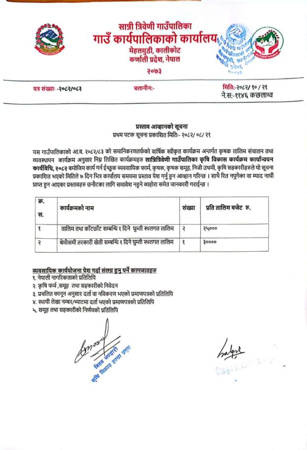 मकै वाली कार्यक्रम अन्तर्गत तपसिल बमोजिमको कार्यक्रम संचालन गर्न ईच्छुक कृषक समुह/कृषि सहकारी/कृषि फर्म तथा कृषि उद्यमीहरुलाई आवेदन पेश गर्ने सम्बन्धी सूचना।