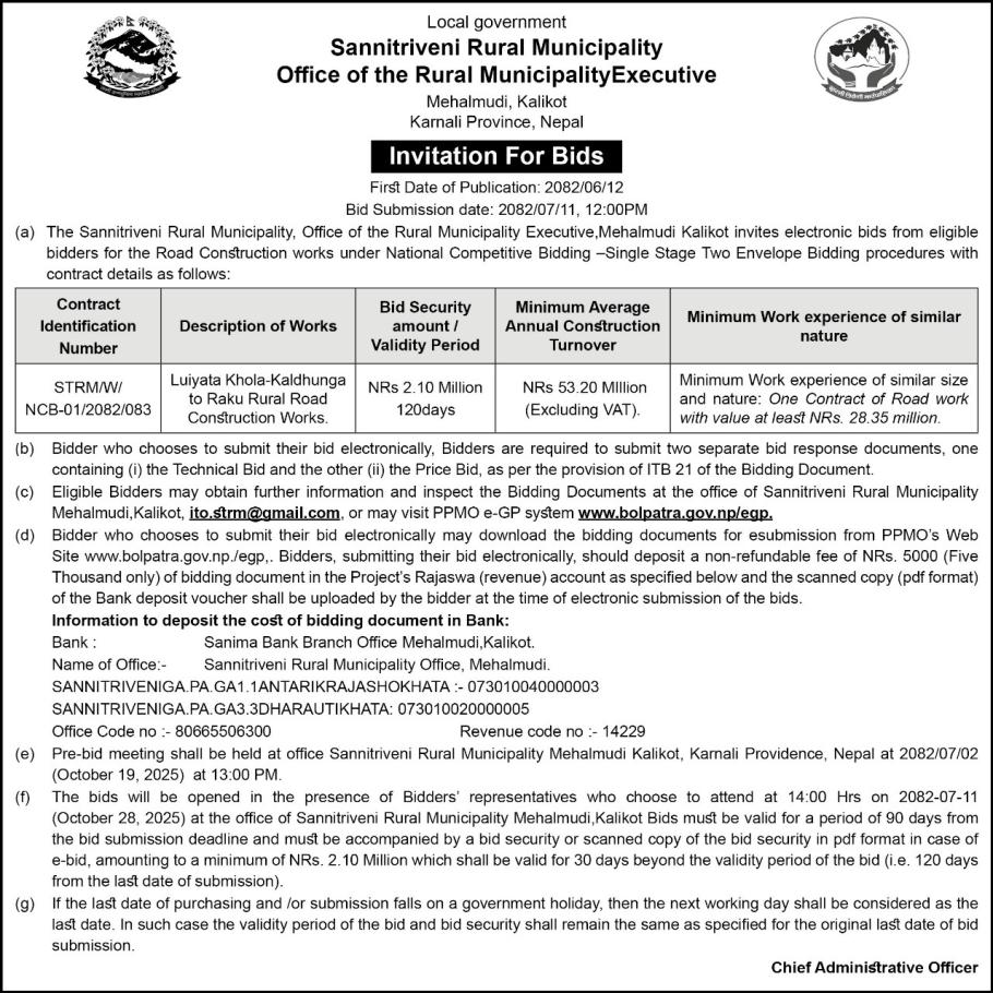 Invitaion for Bids for Sannighat to Rural Municipality Road Upgrading Project