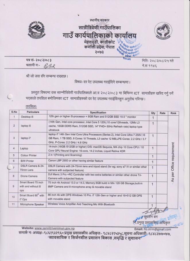 ICT सामाग्रीहरुको दररेट पेश गर्ने सम्बन्धमा ।