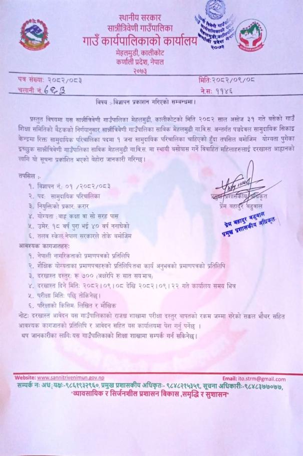 सान्नीत्रिवेणी गाउँपालकिा शिक्षक सरुवा, काज तथा कामकाज सम्बन्धी कार्यविधि-२०८२