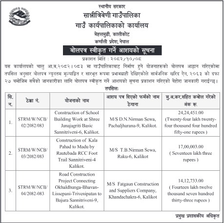 » बोलपत्र स्वीकृत गर्ने आशयको सूचना ।