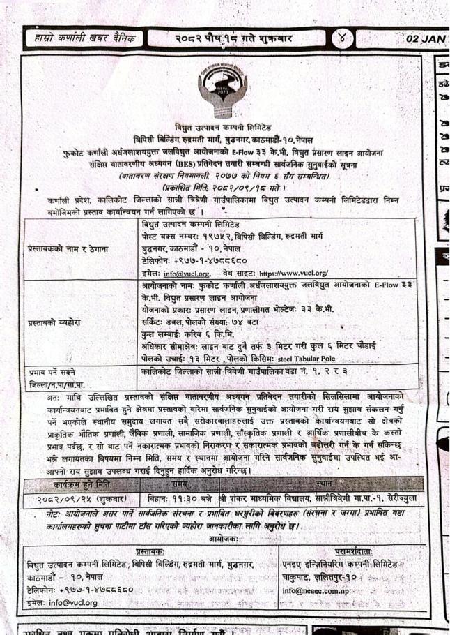 संक्षिप्त वातावरणीय अध्ययन(BES) प्रतिवेदन तयारी सम्बन्धी सार्वजनिक सुनवाईको सूचना